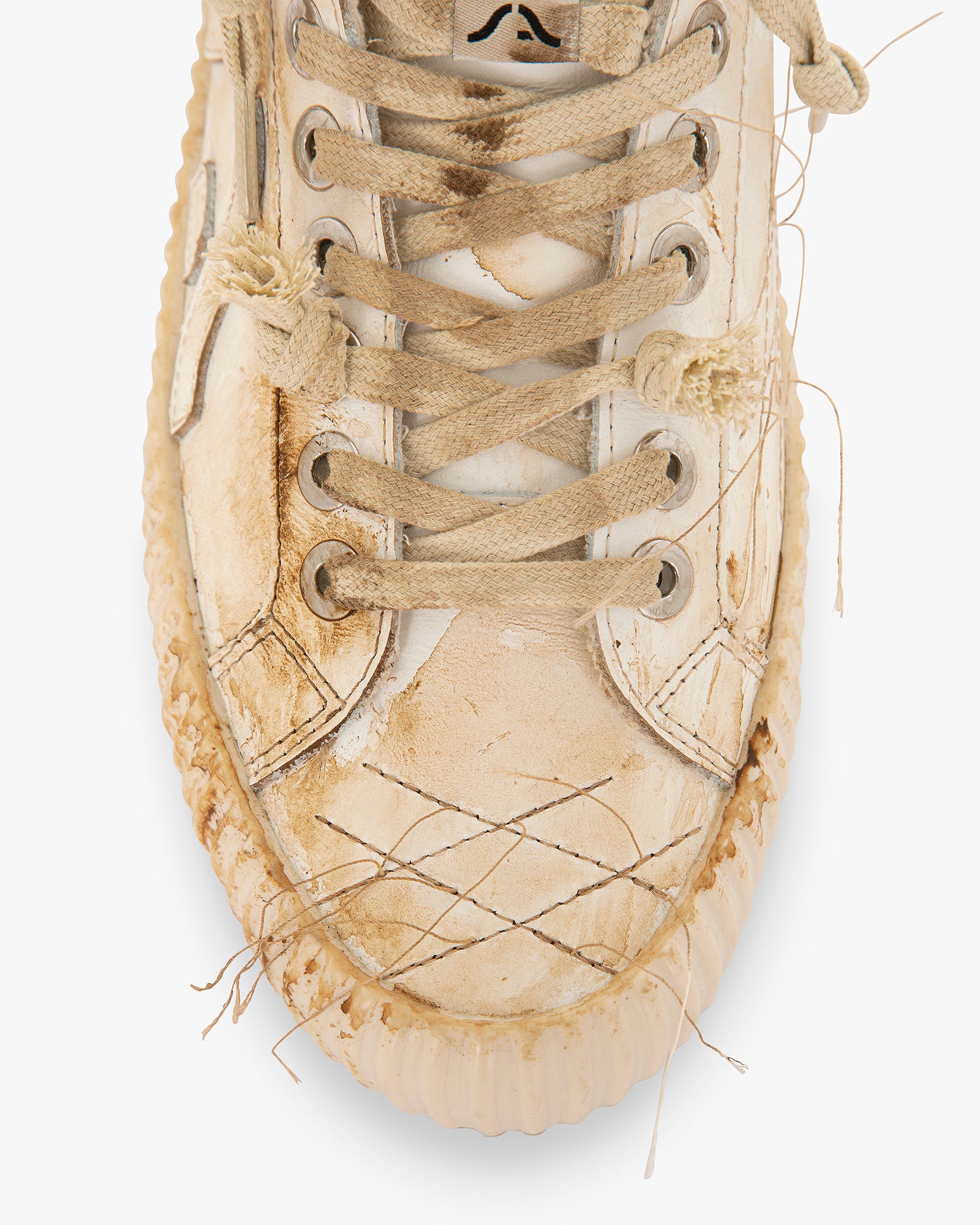 I suoi dettagli sono unici perché realizzata a mano e quindi ogni paio è differente dall’altro. Nella versione bianca i lacci sono di colore beige.